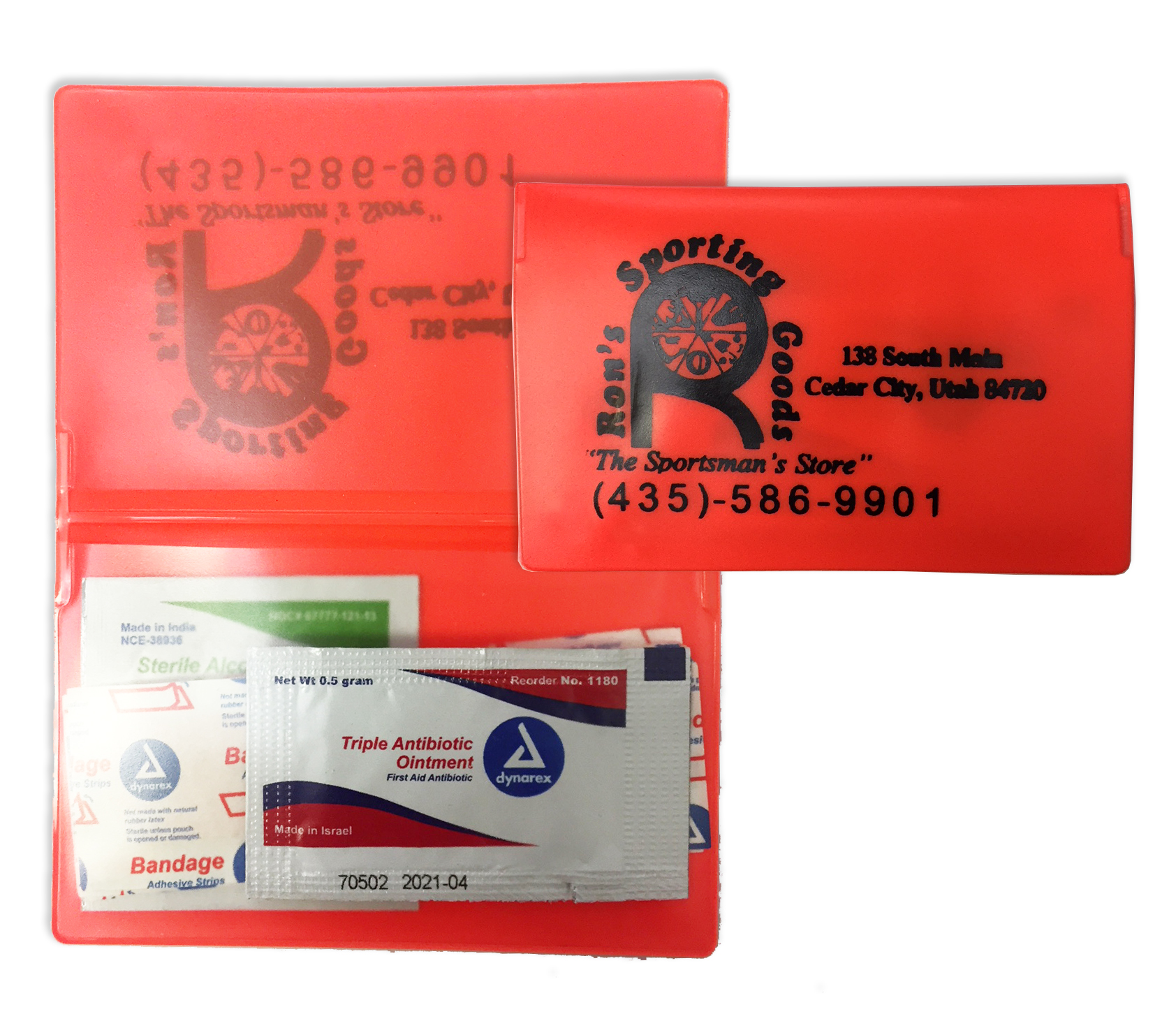 Hunting License Holder – Wallet Style. Fluorescent Orange material provides easy to find license and includes essential first aid supplies for minor cuts & mishaps.
