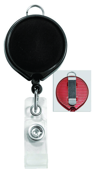 Badge Reel w/ vinyl strap and belt clip. Reel diameter 1.375″ Cord Length 36″. Available in Black, Blue, Red or White.