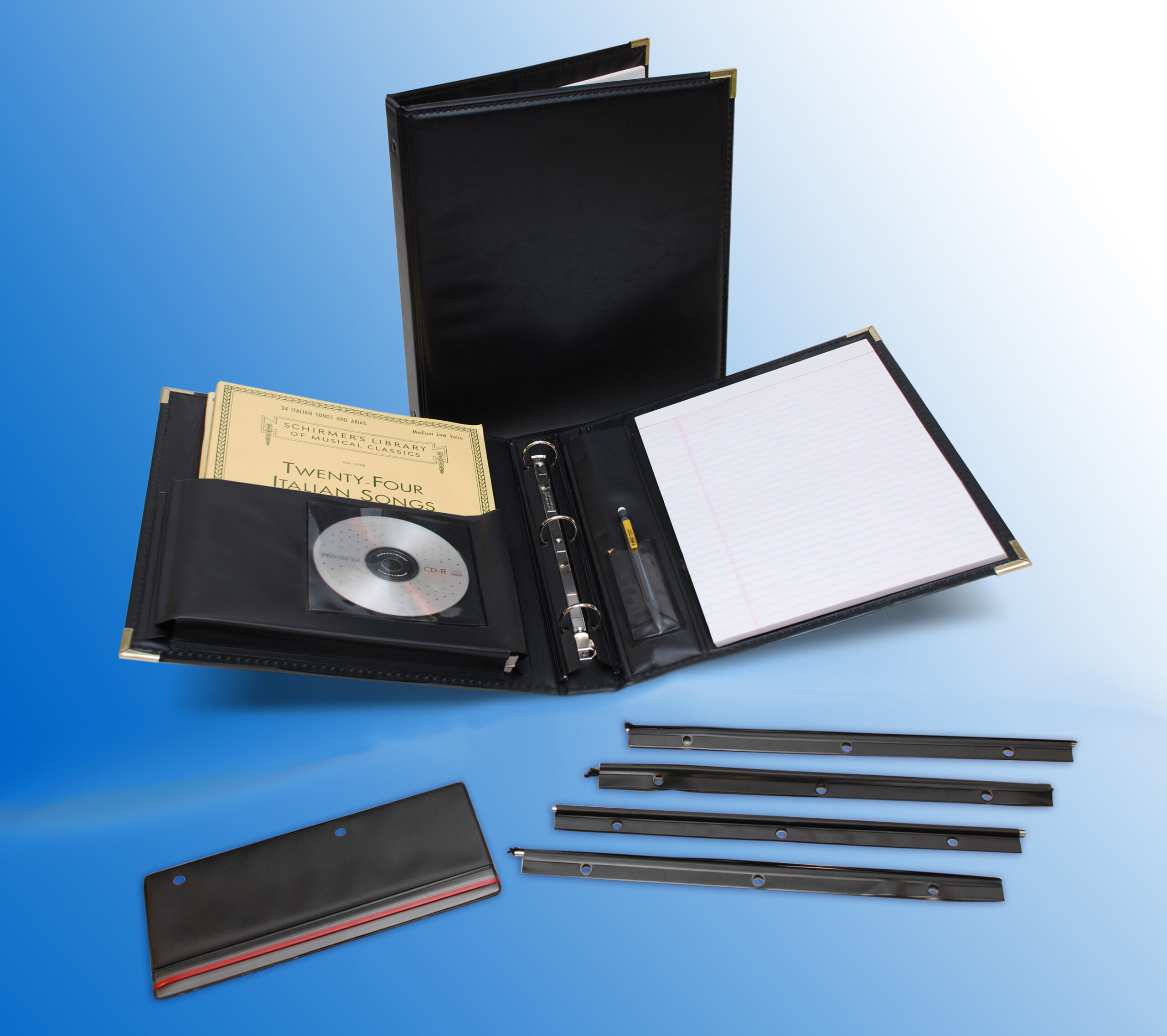 12″ x 13″ This folder is a great for the studio musician, compser or music director. It is durable, professional, versatile and incredibly functional! As well as including features of our top-of-the-line legacy: comfortable padded exterior, sewn edges, brass corners; this folder also features a 1″ ring without boosters to hold even larger music, 4 string-adapters to clip onto the ring and hold music without holes, supply pouch to clip onto the rings or held in the storage pocket when not in use, CD pocket, 2″ expandable pocket with flap to hold large quantities of music and an 8 1/2″ x 11″ ruled pad for any notes.
